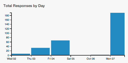 As a class, come to an agreement about how many surveys each student should submit. All students should submit roughly the same number of surveys, and each student should submit at least four surveys. After the first day, use the campaign monitoring tool to see who has collected data. After two to three days, direct students’ attention to the Total Responses by Day plot and comment on any patterns. For example, if they see a plot like the one below, ask "What story does this tell us about our data collection?”