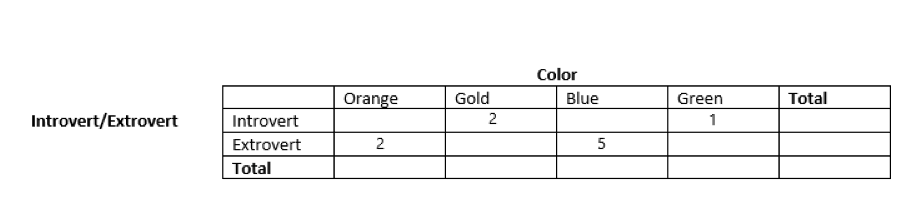 Using the two-way frequency table as reference, you will sketch two new bar graphs. One will be of your predominant color and the other of another color of your choice. Each bar graph will show the distribution of introvert and extrovert designations.