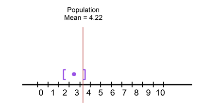 For example: The purple dot represents a sample mean of 3.5. The AMOUNT we have chosen for this particular case is 0.8, so the lower bracket is 0.8 below the sample mean, and the upper bracket is 0.8 above the sample mean. Notice that the population parameter is included within the brackets.