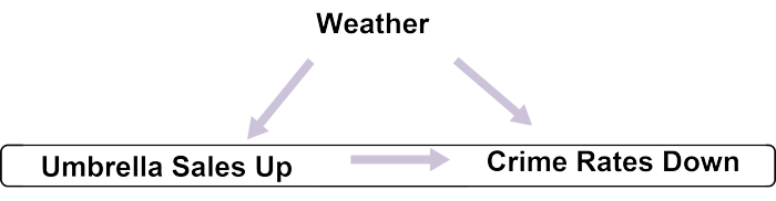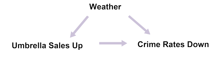 Step 5: Therefore, we have found a confounding factor with the variable “crime rates.” This means we can erase the original “link” between a rise in umbrella sales and decreased crime rates since there are outside variables interfering. We can’t say buying umbrellas causes decreased crime rates, but we can say that a rise in umbrella sales is associated with decreased crime rates.