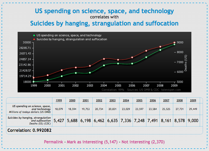 For the example given above, we see that as the U.S. spends more money on science, space, and technology, more people are dying by suicide. Clearly it does not make sense that if the U.S. keeps spending money on science, then more people are going to commit suicide. It simply happened by chance (or a bizarre chain of confounding factors) that the two variables are related to each other.
