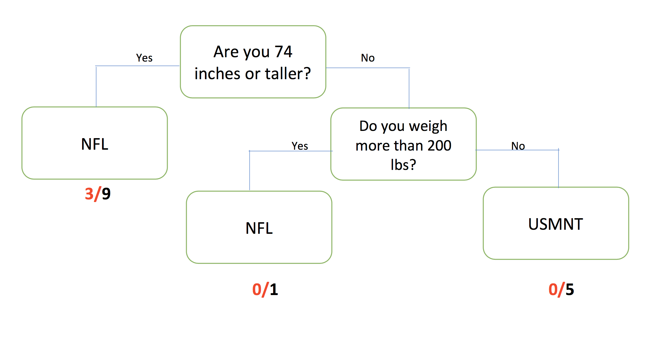 The “player” continues through the nodes until a “leaf” declares the “player” to be either (1) a soccer player on the US Men’s National Team, OR (2) a football player in the National Football League (NFL).