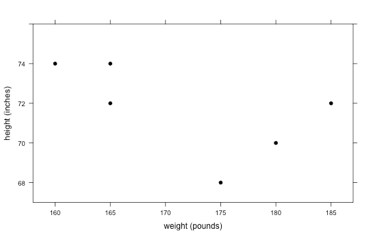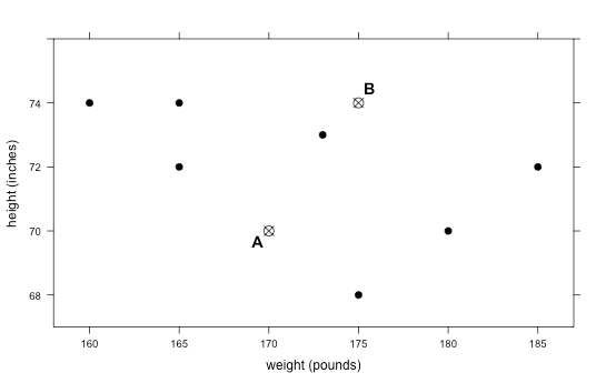 He has collected data over the past few years on each player’s weight (in pounds) and height (in inches). He informs us that weight was coded as the variable X1, and height was coded as the variable X2. You can re-label the scatterplot with this new information.