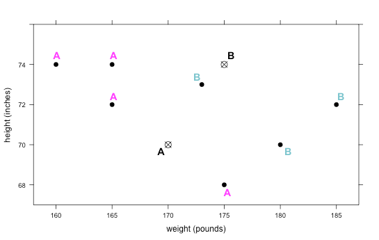 For now, we will start with the following two points as guesses for the means of each group: A: (170, 70) and B: (175, 74). In the “Round 1” plot on the Find the Clusters handout, each student should plot and label these two points.