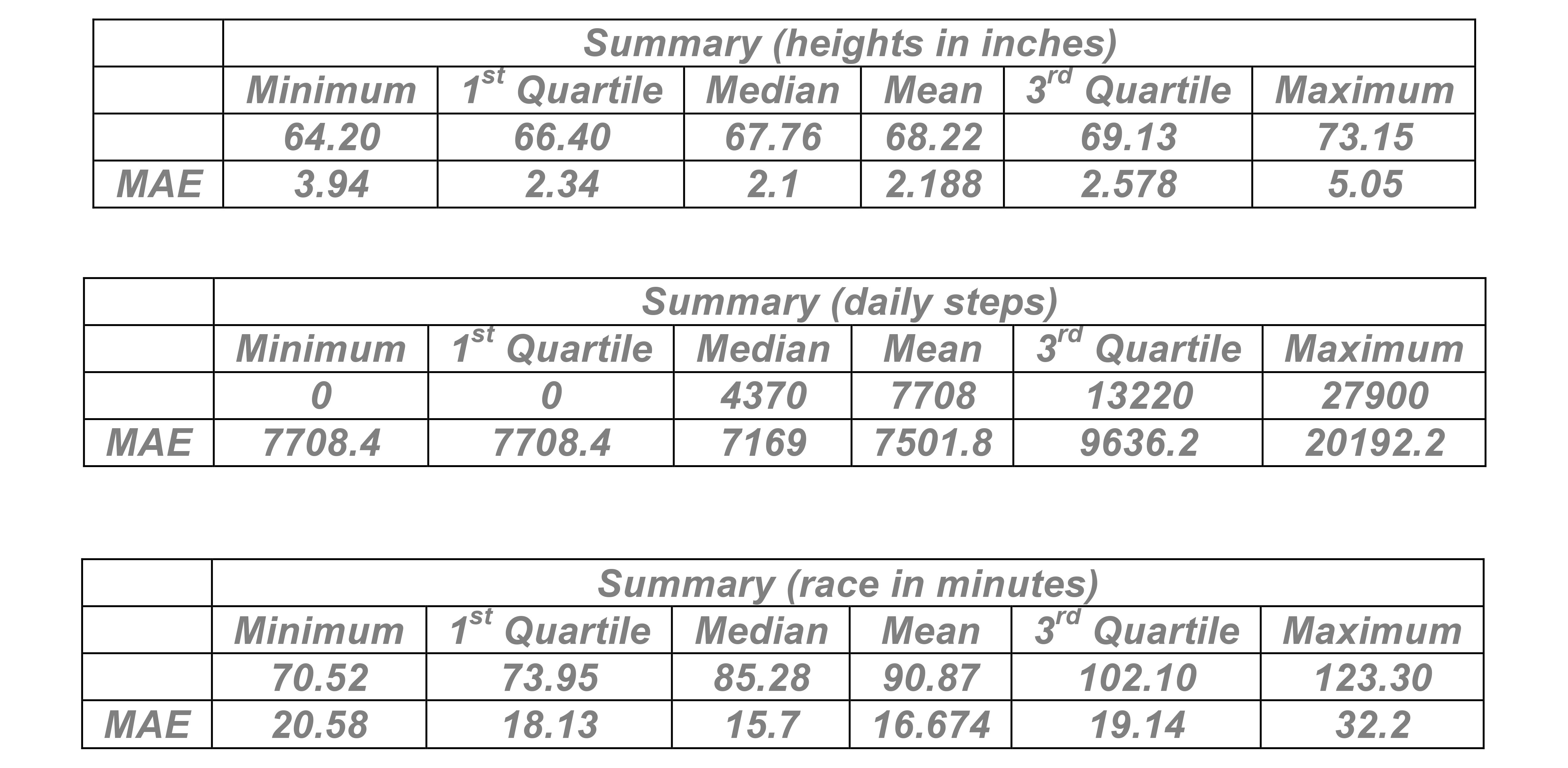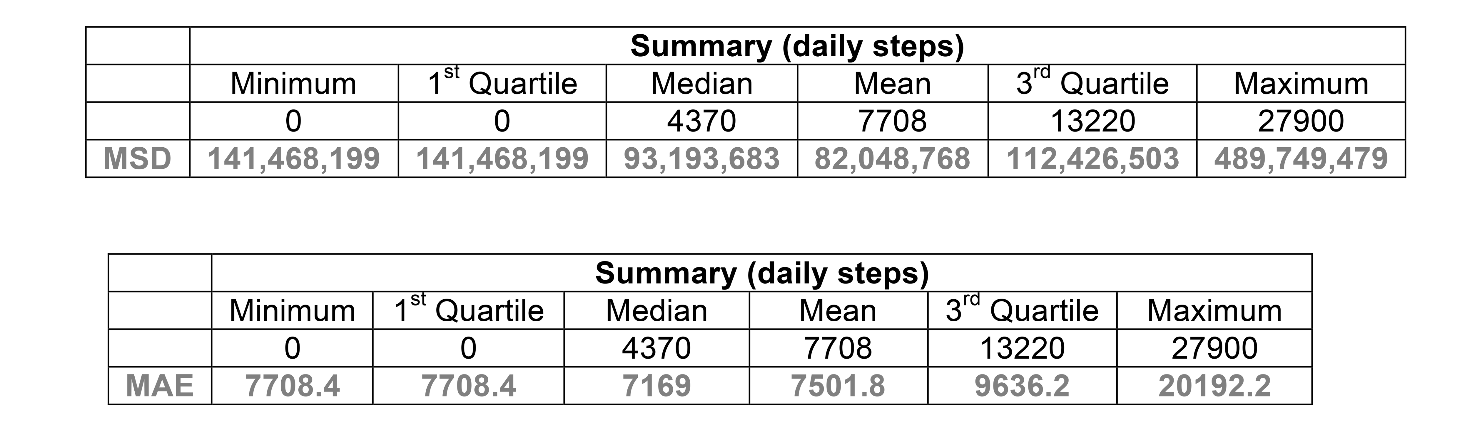 Outcomes: here are the actual daily steps that this person took – 0, 27903, 6044, 0, 0, 17436, 2697, 14944, 8060, 0. Which of these numbers did best? Compare your score using the mean squared deviations.